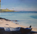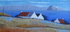 Her main themes are inspired by these childhood experiences. Deserted beaches of remote islands and thatched cottages in Western Scotland. She is particularly drawn to the luminescent skies and seas of the West Coast where the colours and light inspire her seascape paintings.